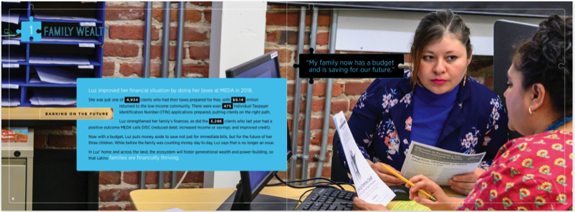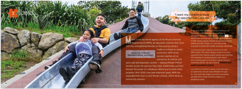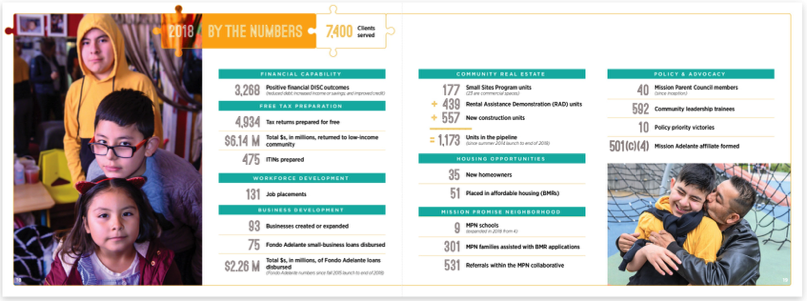 In 2018 over seven thousand residents of San Francisco's Mission District were helped by the Mission Economic Development Agency. MEDA provides financial literacy trainig, a cradle to college to career initiative, affordable housing and community advocacy. You can see the whole report here.